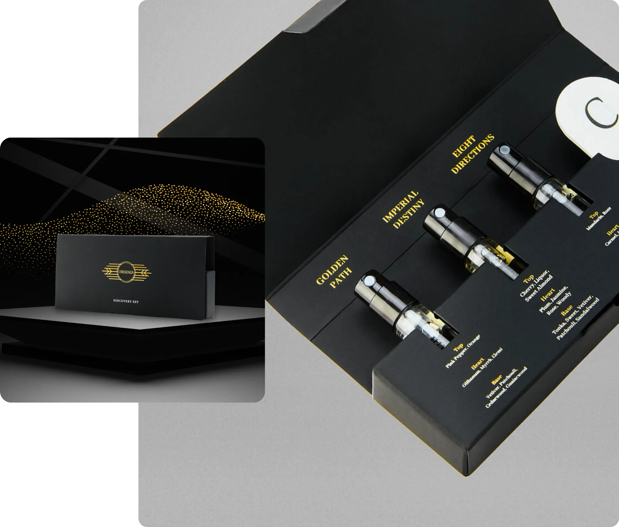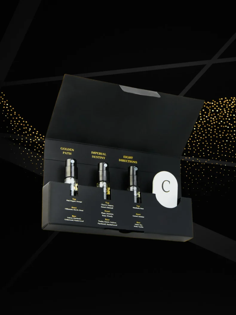 Trei parfumuri signature — Imperial Destiny, Golden Path și Eight Directions — create din esențe premium, cu persistență îndelungată și sillage elegant. Descoperă și Testing Kit pentru a-ți găsi semnătura olfactivă.